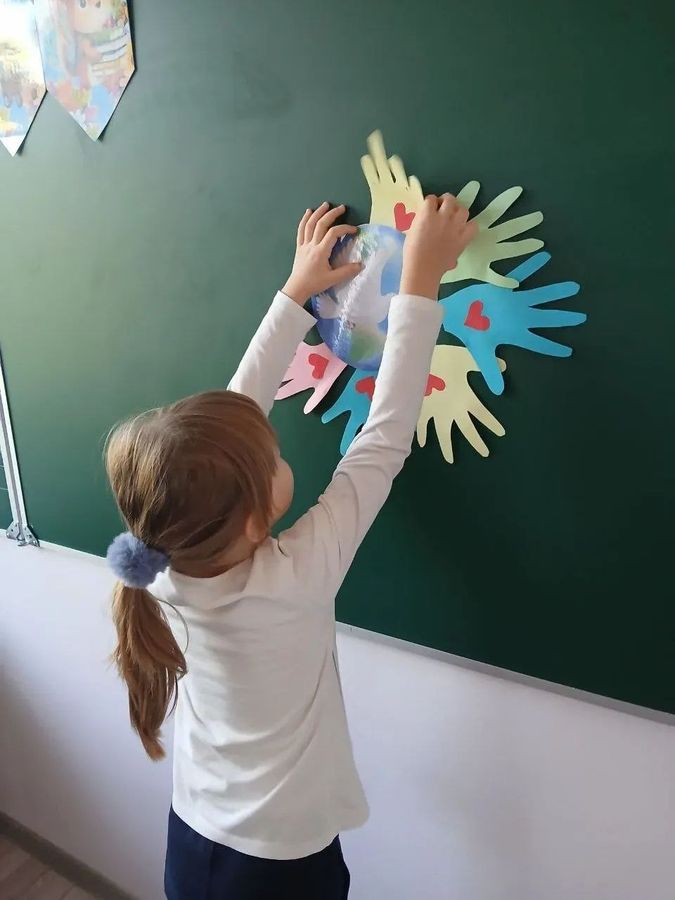 Начальная школа приняла участие в акции «Нам нужен мир». В классах прошли классные часы, ребята постарались, подготовились к проведению, вырезали ладошки из цветной бумаги и символично отдали свои голоса за мир во всем мире. Цветные ладошки и традиционный символ мира - белый голубь, украсили классы и фойе школы.
