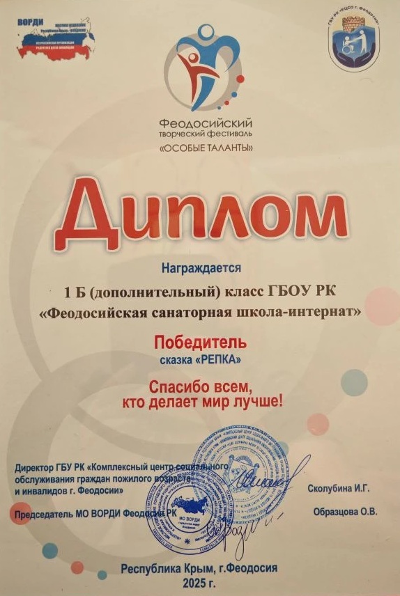 2 декабря 2025 года учащиеся класса 1Б(ДОП) приняли участие в Феодосийском творческом фестивале «Особые таланты» с театрализованной сказкой «Репка».