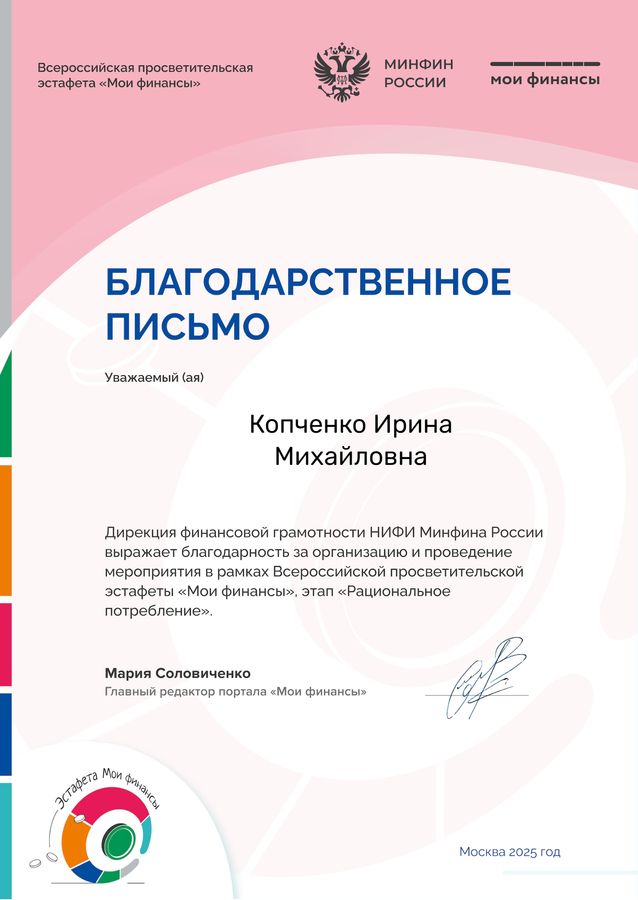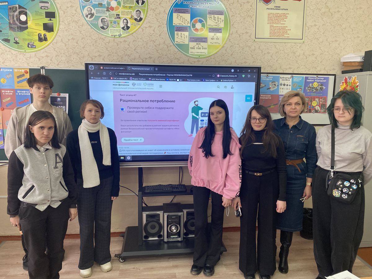 Обучающиеся 10-11 классов, во главе с учителем обществознания Копченко Ириной Михайловной, активно включились в 7-й этап Всероссийской просветительской эстафеты «Мои финансы» Министерства финансов Российской Федерации, который посвящен РАЦИОНАЛЬНОМУ ПОТРЕБЛЕНИЮ.