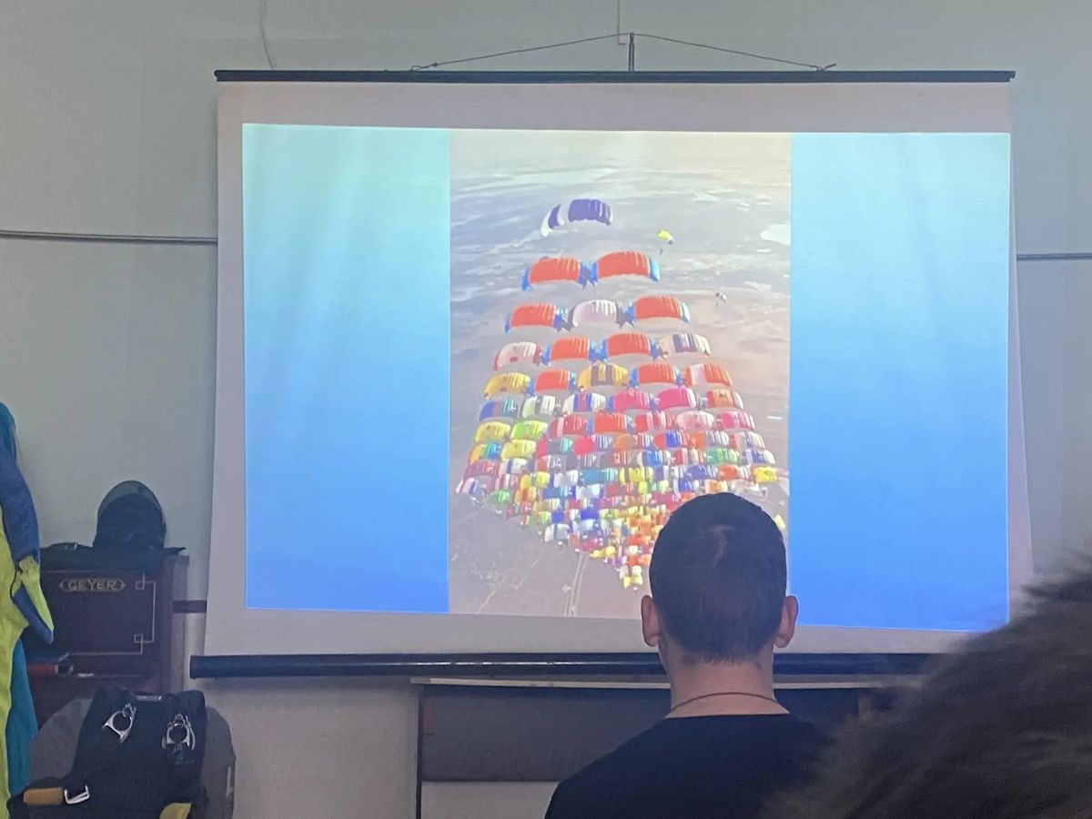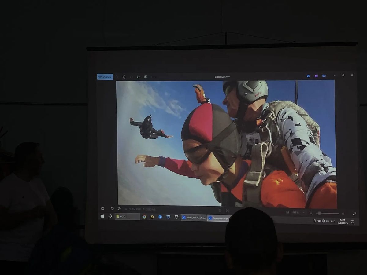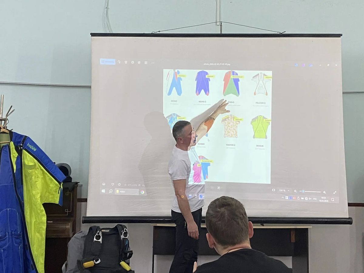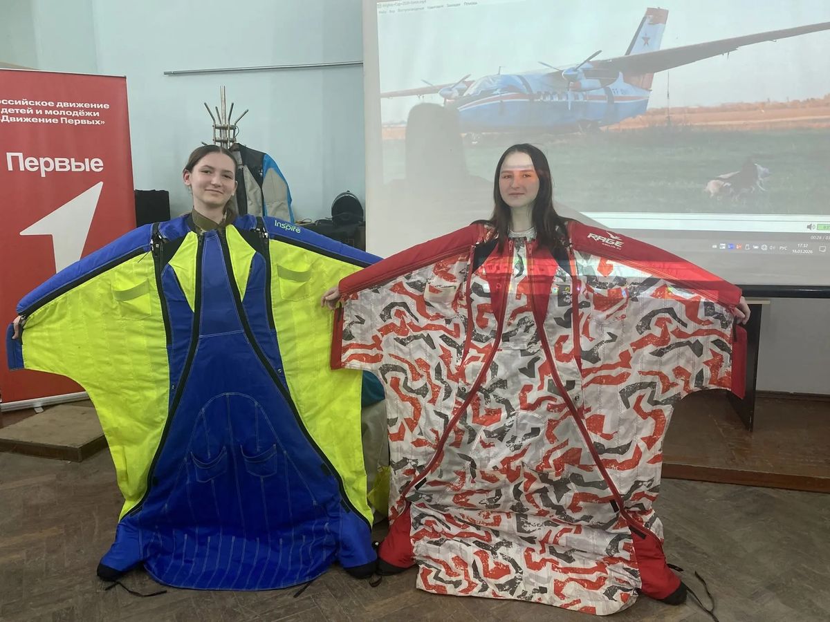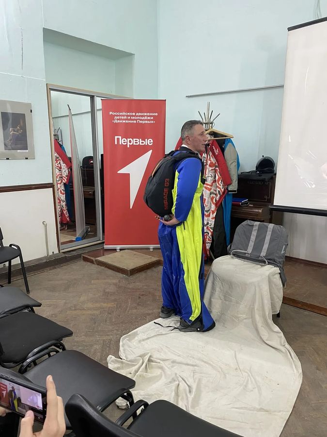 На встрече ребята познакомились с историей парашютного спорта, дисциплинами, попрактиковались в надевании костюма для вингсьрта и личной историей успеха Игоря Станиславовича.