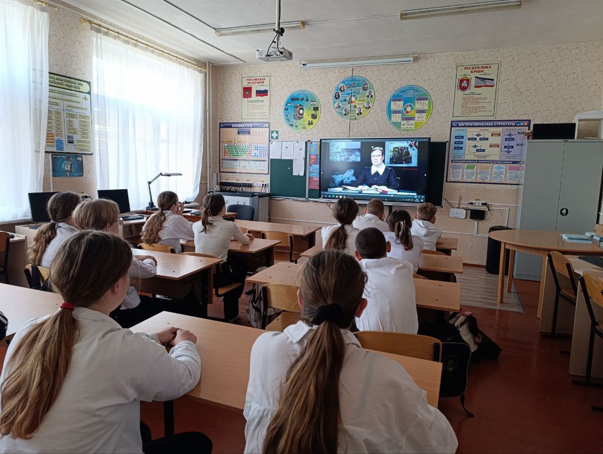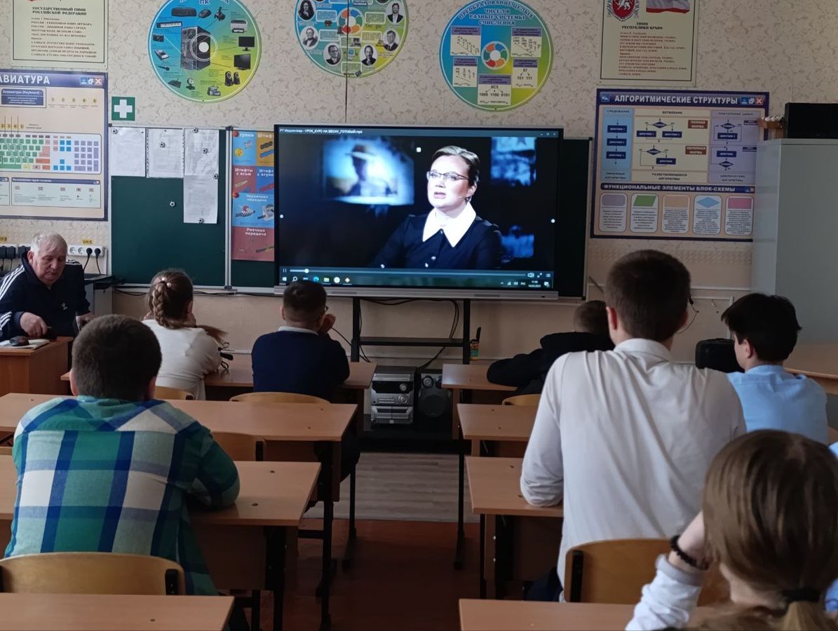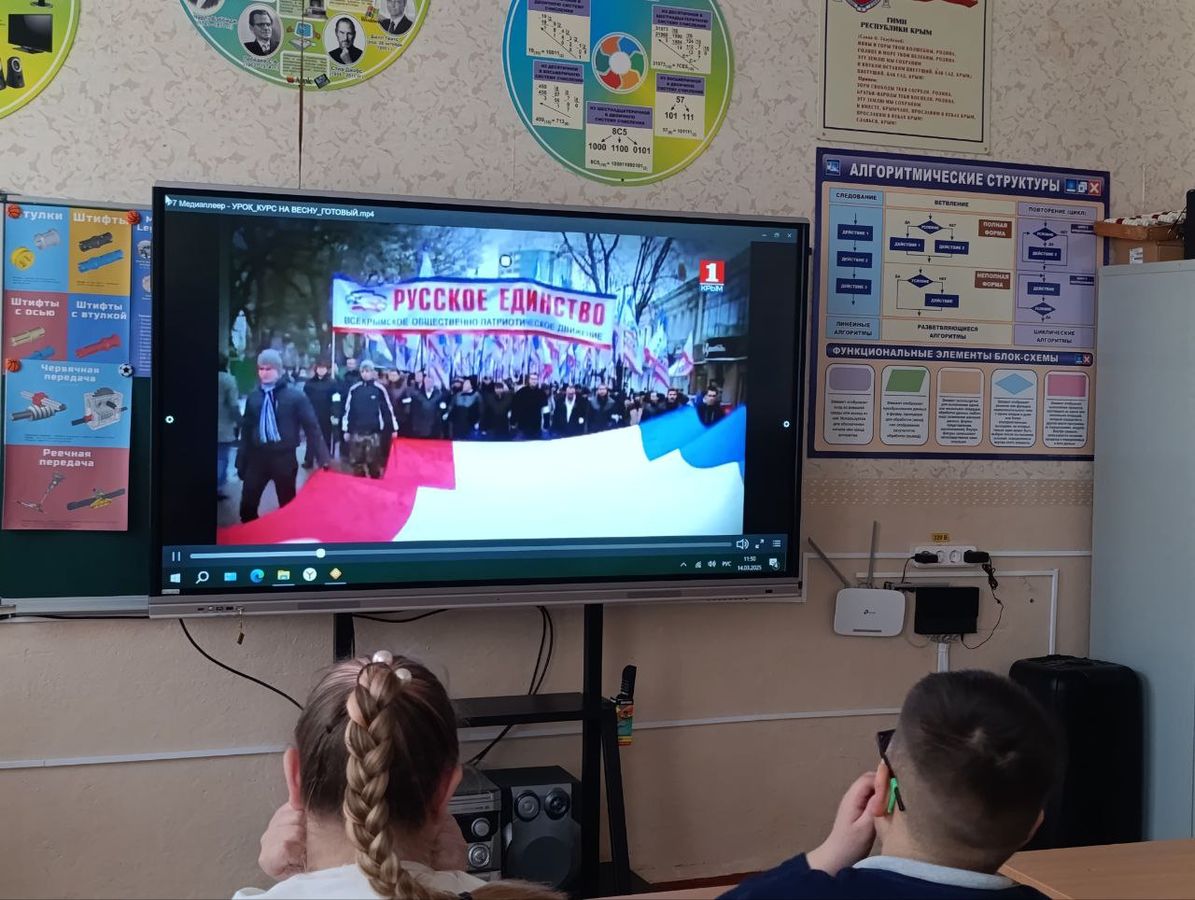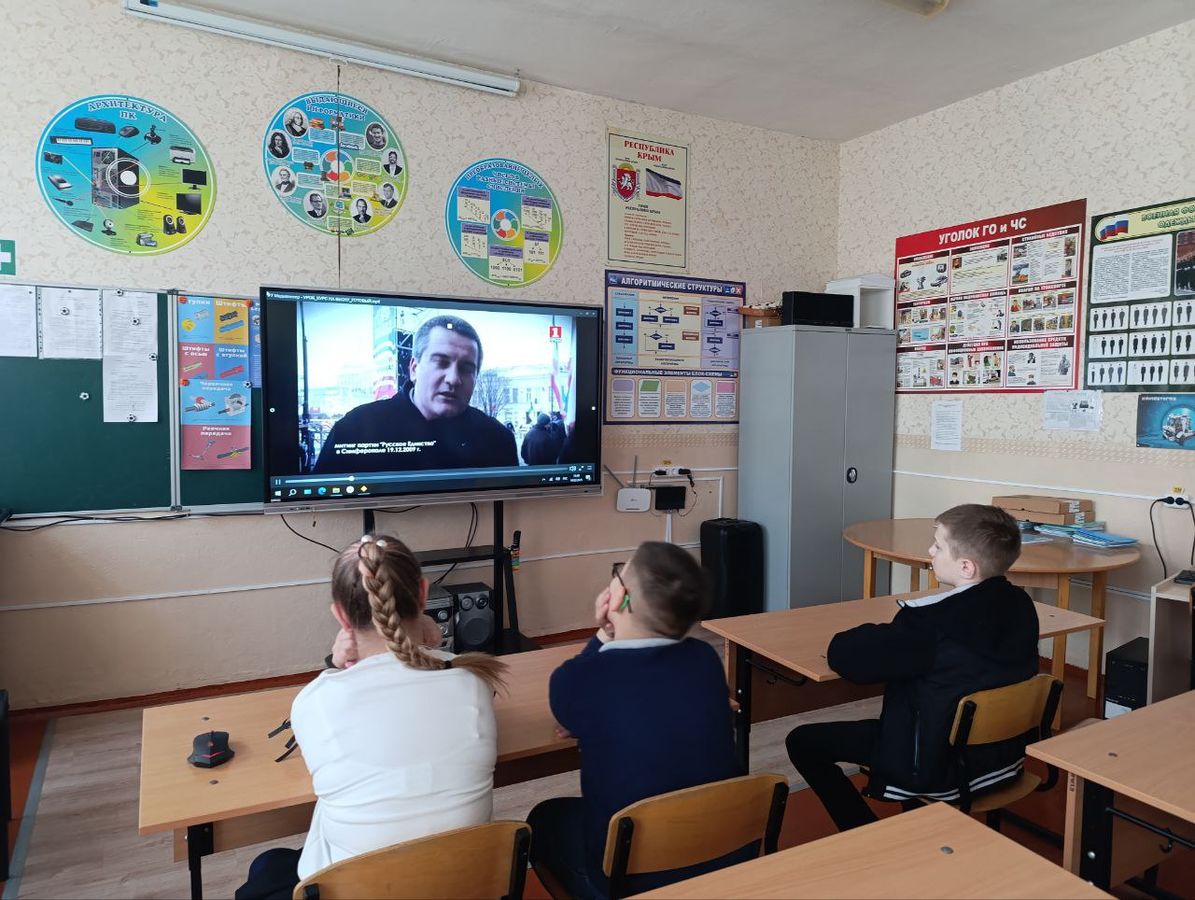Празднично украшенное фойе школы, торжественная линейка, посвященная знаменательному событию, музыкальное сопровождение и просмотр тематических видеороликов, участие в интерактивной игре-викторине «Крым и Россия!» – далеко не полный перечень подготовки школы. В рамках плана мероприятий, посвященных празднованию годовщины воссоединения Крыма с Россией, в школе-интернате был организован кинопоказ документального фильма «Курс на весну», в котором рассказывалось о событиях, предшествующих «Крымской весне».