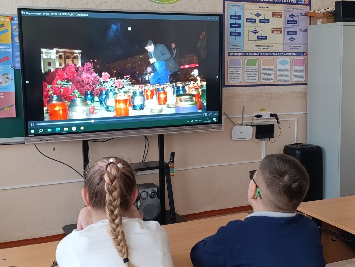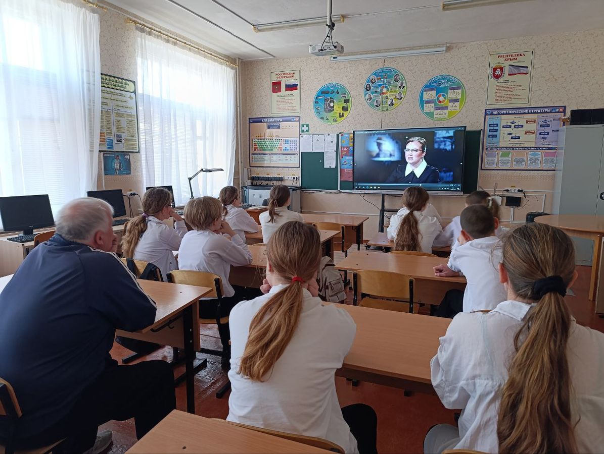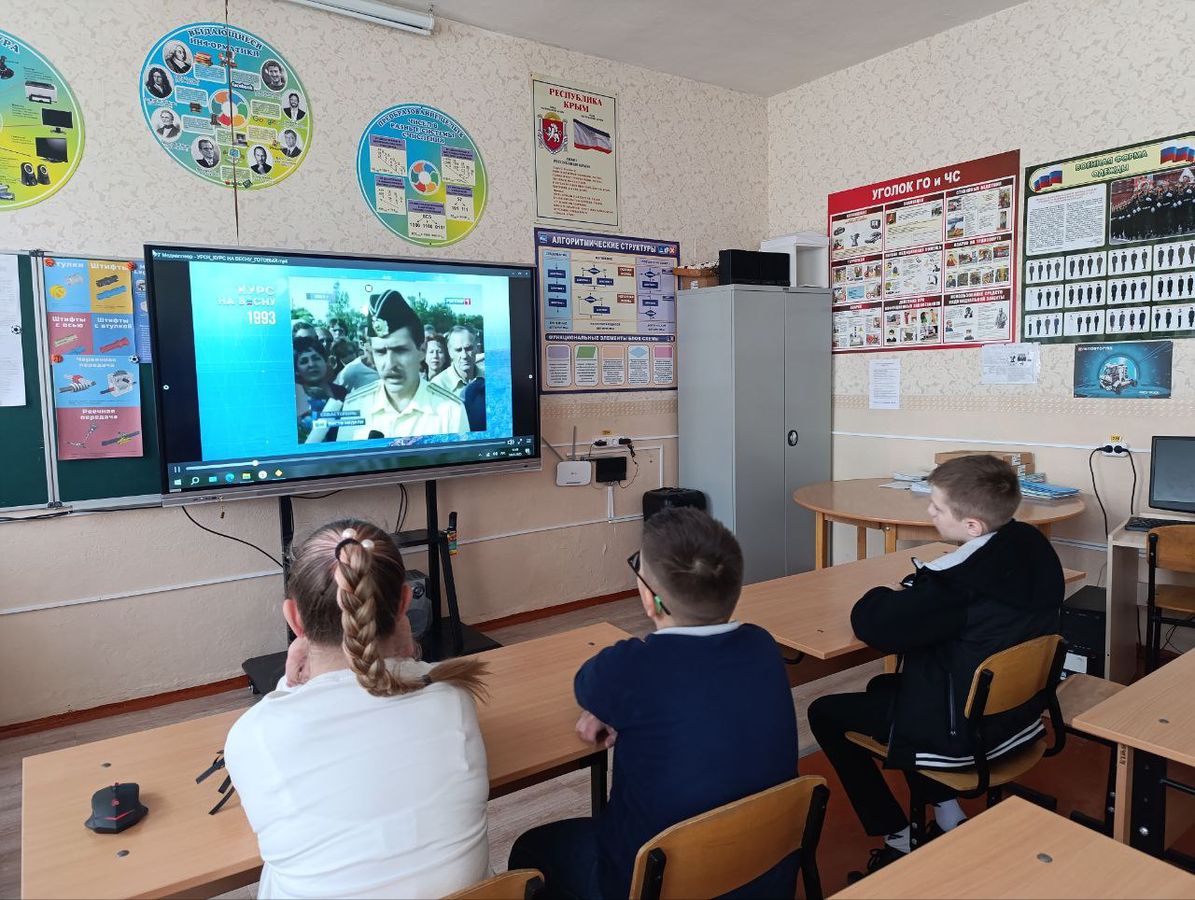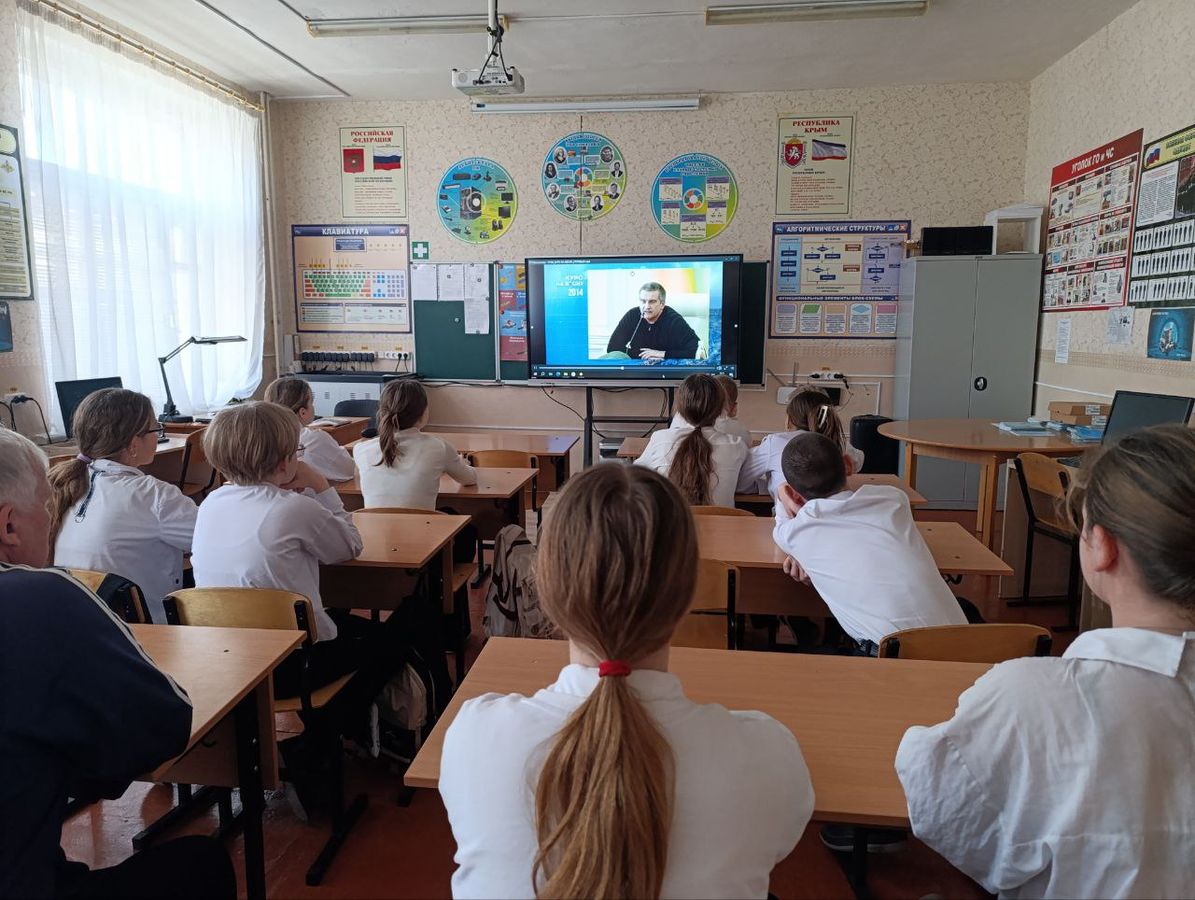 Празднично украшенное фойе школы, торжественная линейка, посвященная знаменательному событию, музыкальное сопровождение и просмотр тематических видеороликов, участие в интерактивной игре-викторине «Крым и Россия!» – далеко не полный перечень подготовки школы. В рамках плана мероприятий, посвященных празднованию годовщины воссоединения Крыма с Россией, в школе-интернате был организован кинопоказ документального фильма «Курс на весну», в котором рассказывалось о событиях, предшествующих «Крымской весне».