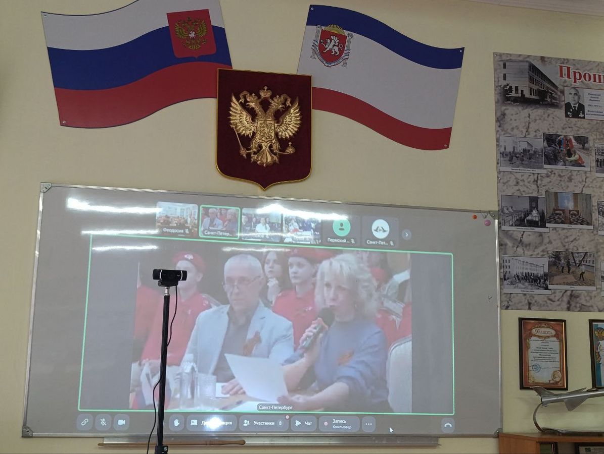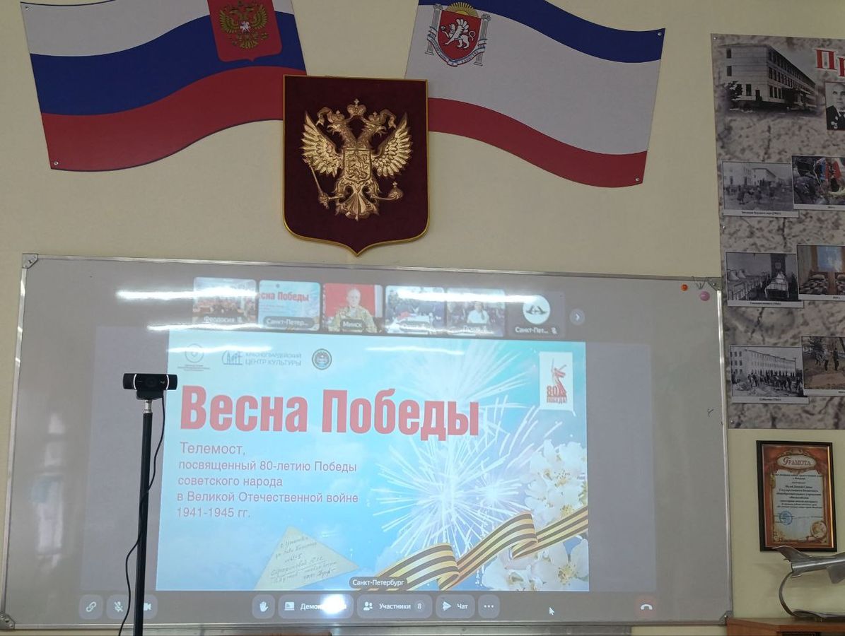 Именно под таким названием 25 апреля, накануне 80-летия Великой Победы, Республика Крым приняла участие в международном телемосте между городами: Минск, Орша (Беларусь), Псков, Пермский край г.Кудымкар (Россия), Феодосия (Республика Крым). Организатор телемоста - СПб ГБУ КДЦ «Красногвардейский» г. Санкт –Петербург.