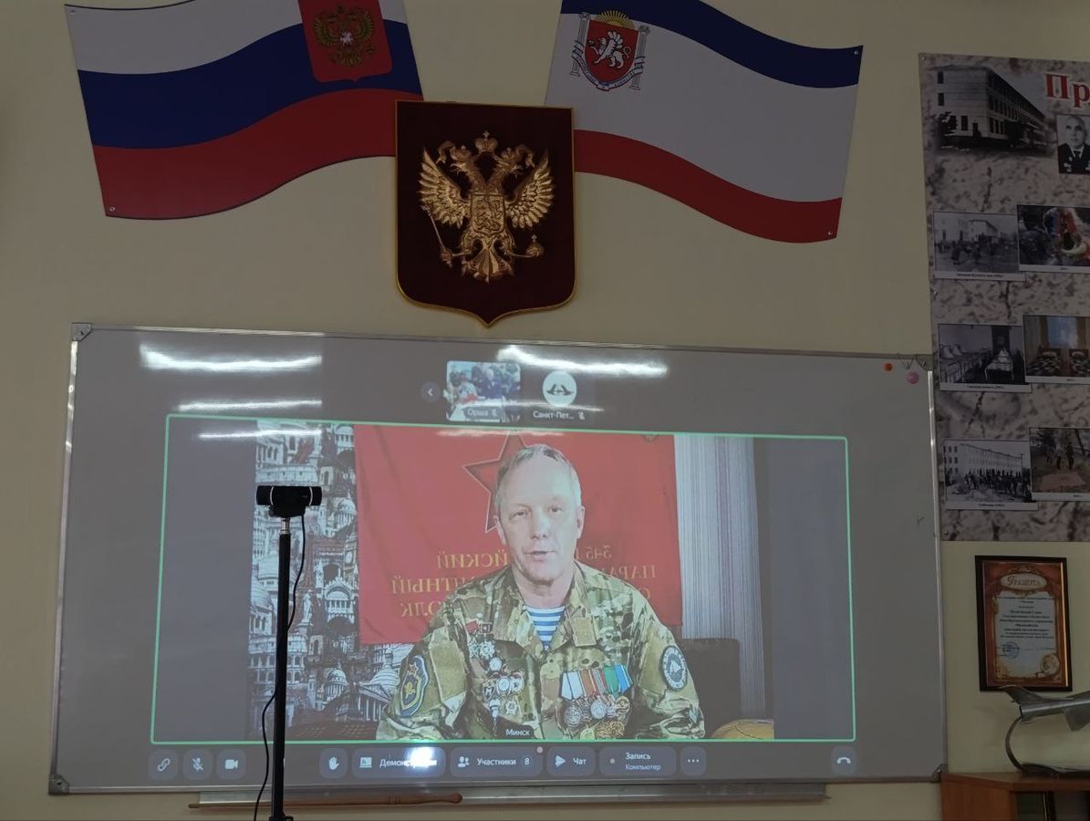 От города Феодосии, представляющей Республику Крым, на теле-встрече присутствовали уважаемые гости: Туров Александр Владимирович – советник главы Республики Крым, ГРЯЗНОВ Антон Олегович – Председатель Союза советских офицеров и ветеранов СВО Феодосии, руководитель Феодосийского отделения Российского Военно-Исторического Общества, кандидат педагогических наук, капитан 1 ранга запаса. Его коллеги: БАЛАКИН Павел Алексеевич – член Союза советских офицеров и МОРОЗОВ Николай Николаевич – член Союза советских офицеров, воин-интернационалист, ветеран СВО.