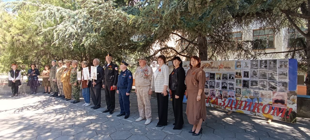 Парад Победы открыло Знамя Победы, торжественно внесенное под музыку «Священная война». Парадные расчеты под командованием юных командиров строевым шагом проходили мимо стенда «Бессметрный ПОЛК», отдавая честь героям-победителям, прадедушкам наших воспитанников, чьи портреты они принесли из дому для проведения мероприятия.