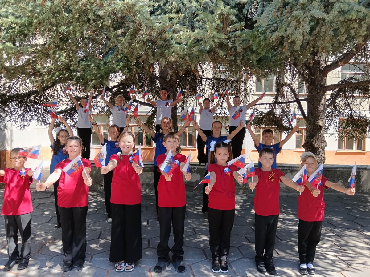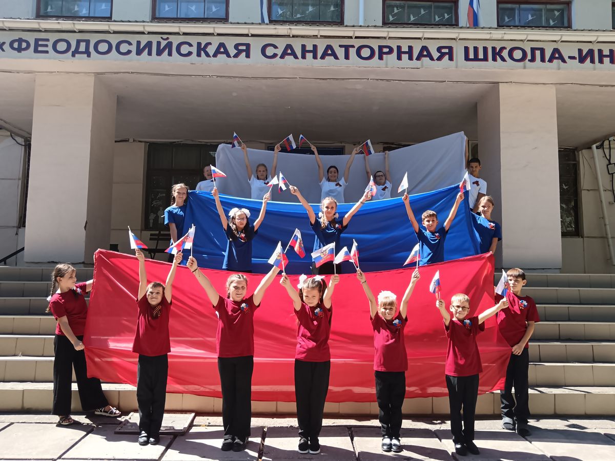 Флаг - это символ государства, который связывает воедино прошлое, настоящее и будущее. Сам праздник — День Государственного флага Российской Федерации — не является выходным днем, но уже традиционно к этой важной дате приурочено множество мероприятий — торжественные шествия, праздничные концерты, тематические выставки, молодежные флешмобы, авто-мото пробеги и др. Их главная цель — рассказать россиянам историю праздника, важность и значение государственных символов России. Конечно же, наша школа-интернат не осталась в стороне. Ребята создали «живой флаг» на пороге родной школы.