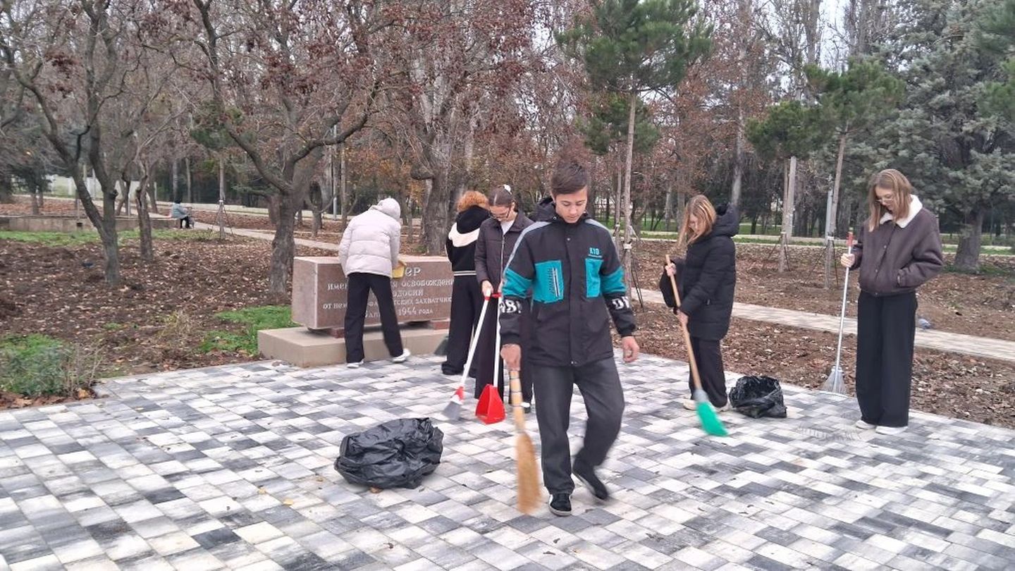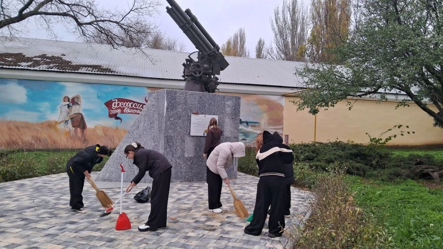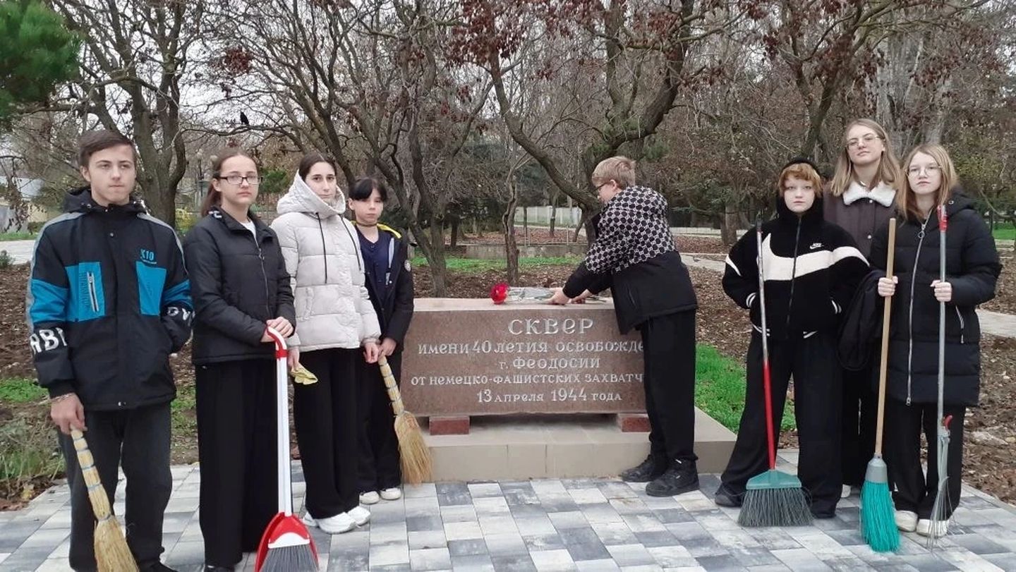 Активисты первичного отделения и учащиеся 8 класса ГБОУ РК «Феодосийская санаторная школа-интернат» в Сквере им. 40-летия освобождения Феодосии от немецко-фашистских захватчиков осуществили уборку мусора, удаление листвы, очистили памятные надписи на мемориале и памятном знаке «Зенитное орудие», который вернулся в сквер имени 40-летия освобождения города Феодосии.