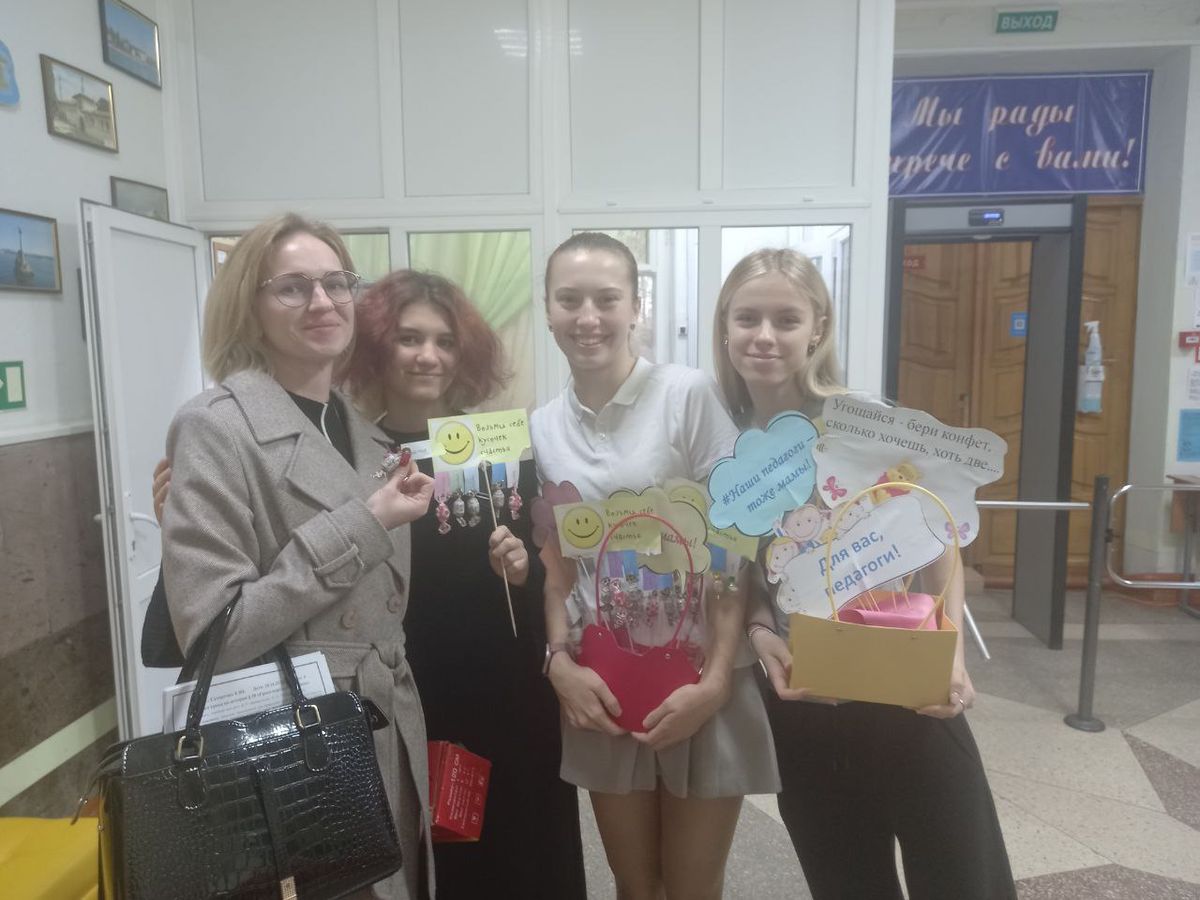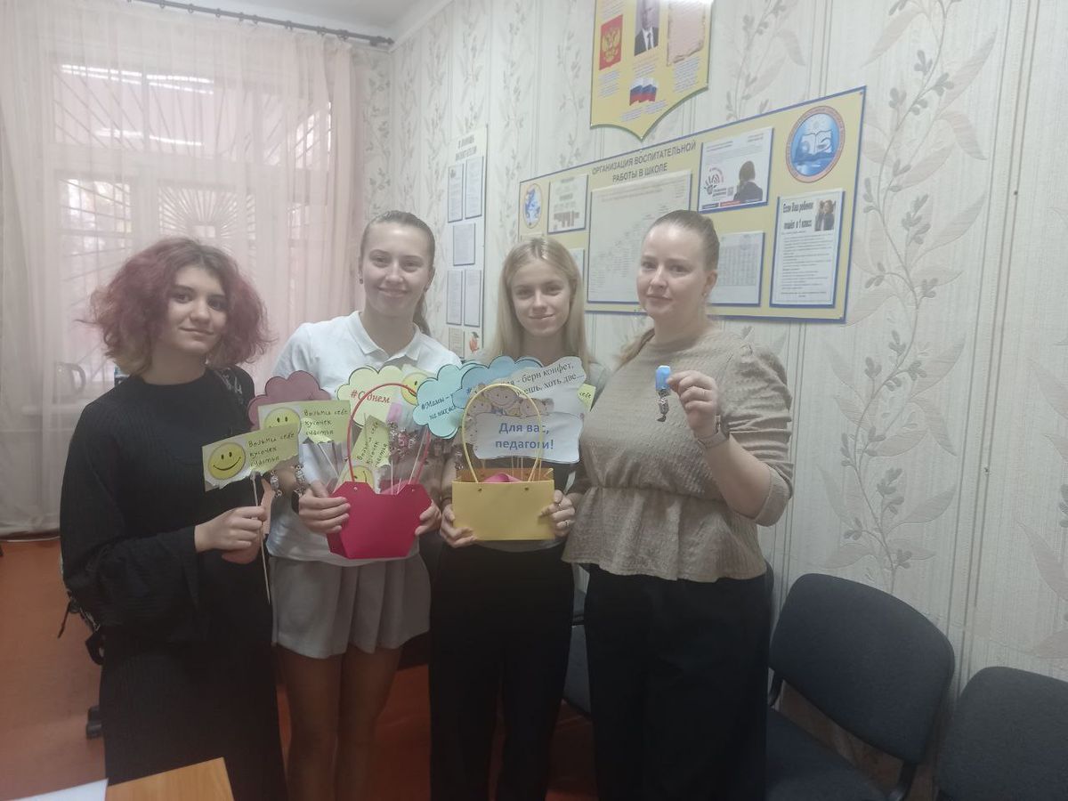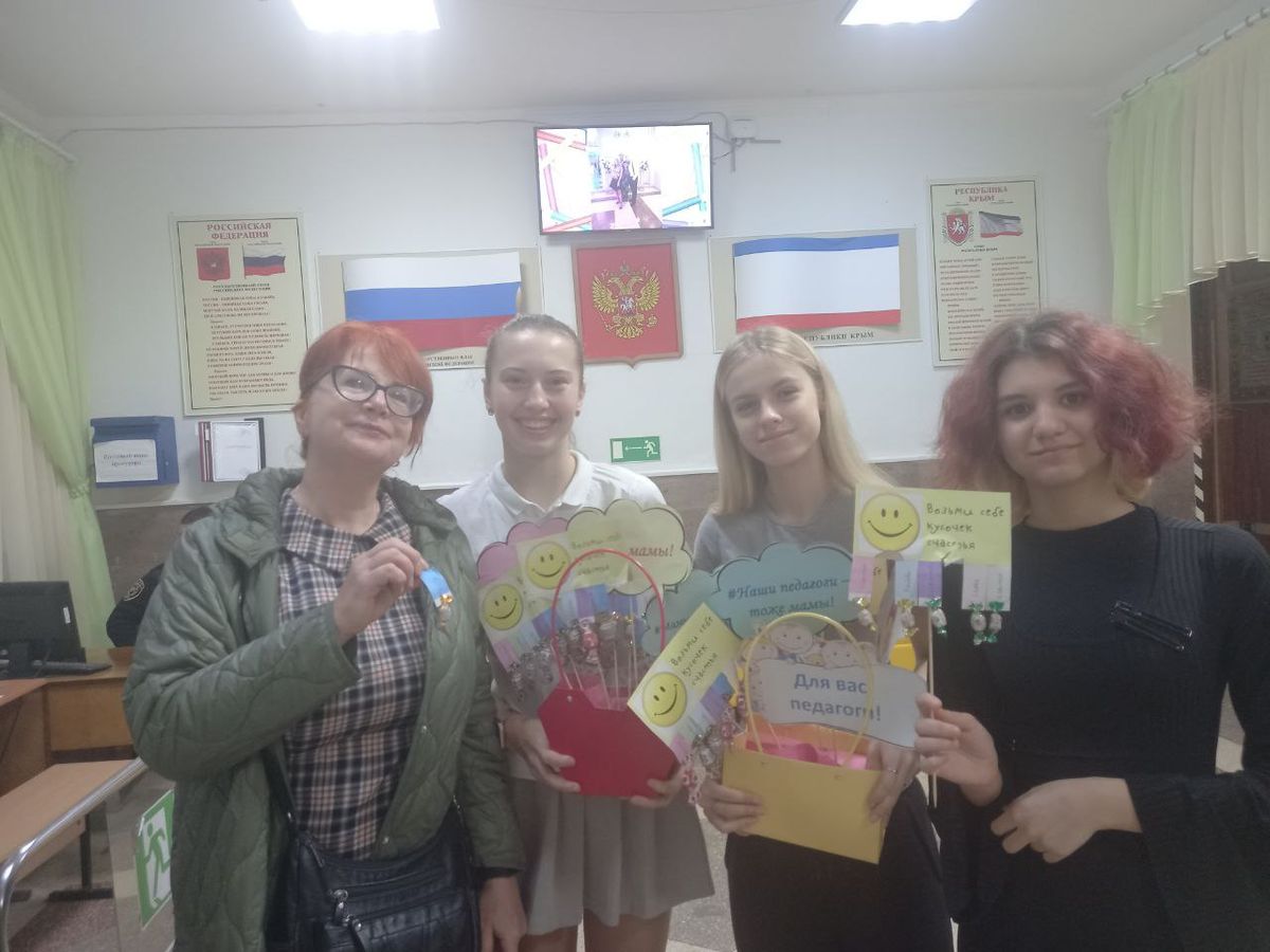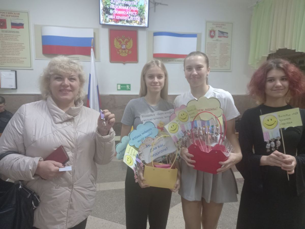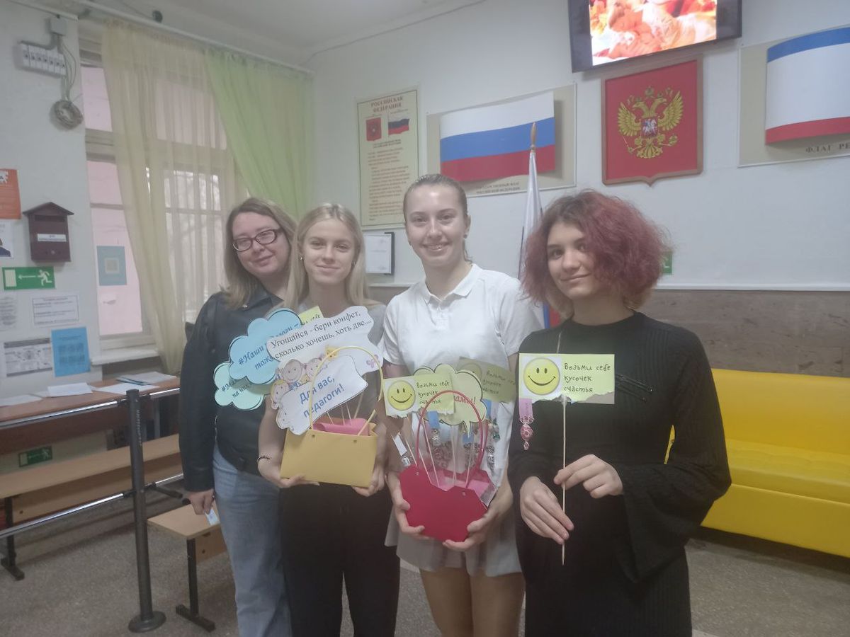 Активисты Движения Первых выступили организаторами выставки «Загляните в семейный альбом», на которую предоставлены фотографии педагогов школы вместе со своими детьми. В предпраздничный день на пороге школы учителей встречали ребята с корзинками пожеланий и сладких конфет. Они говорили: «Возьмите конфетку, начните день с хорошего настроения!».