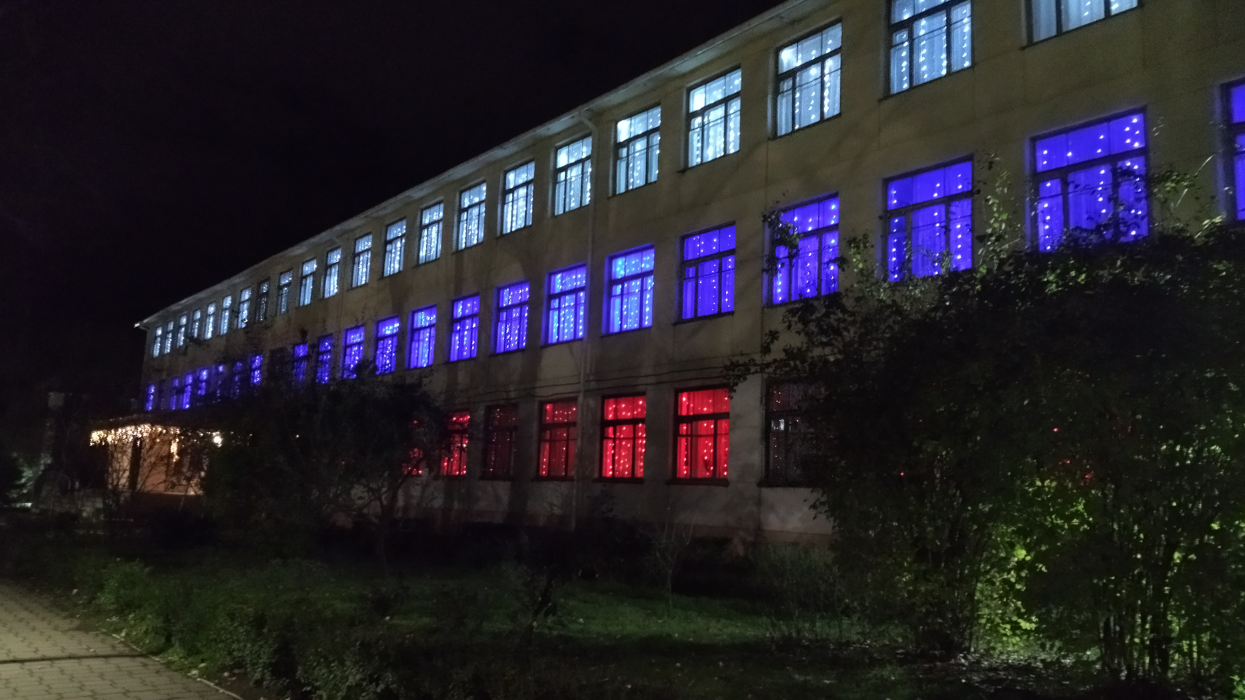 Учащиеся и педагоги с большим энтузиазмом украсили окна фасада здания школы-интерната. Белые, синие и красные цвета заполнили пространство, создавая ощущение гордости за страну.