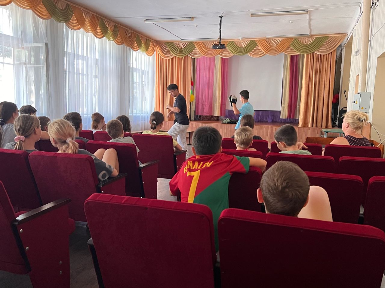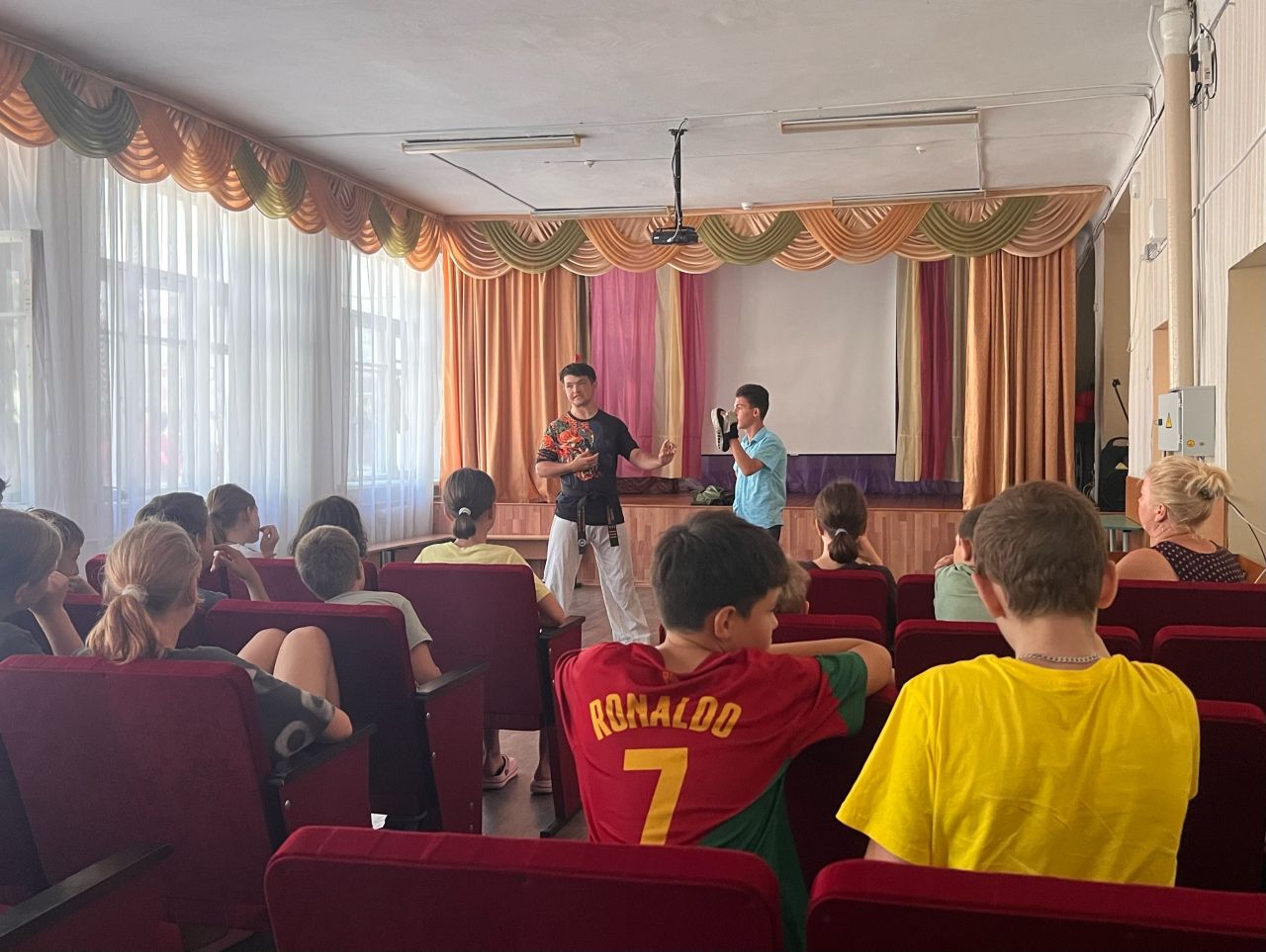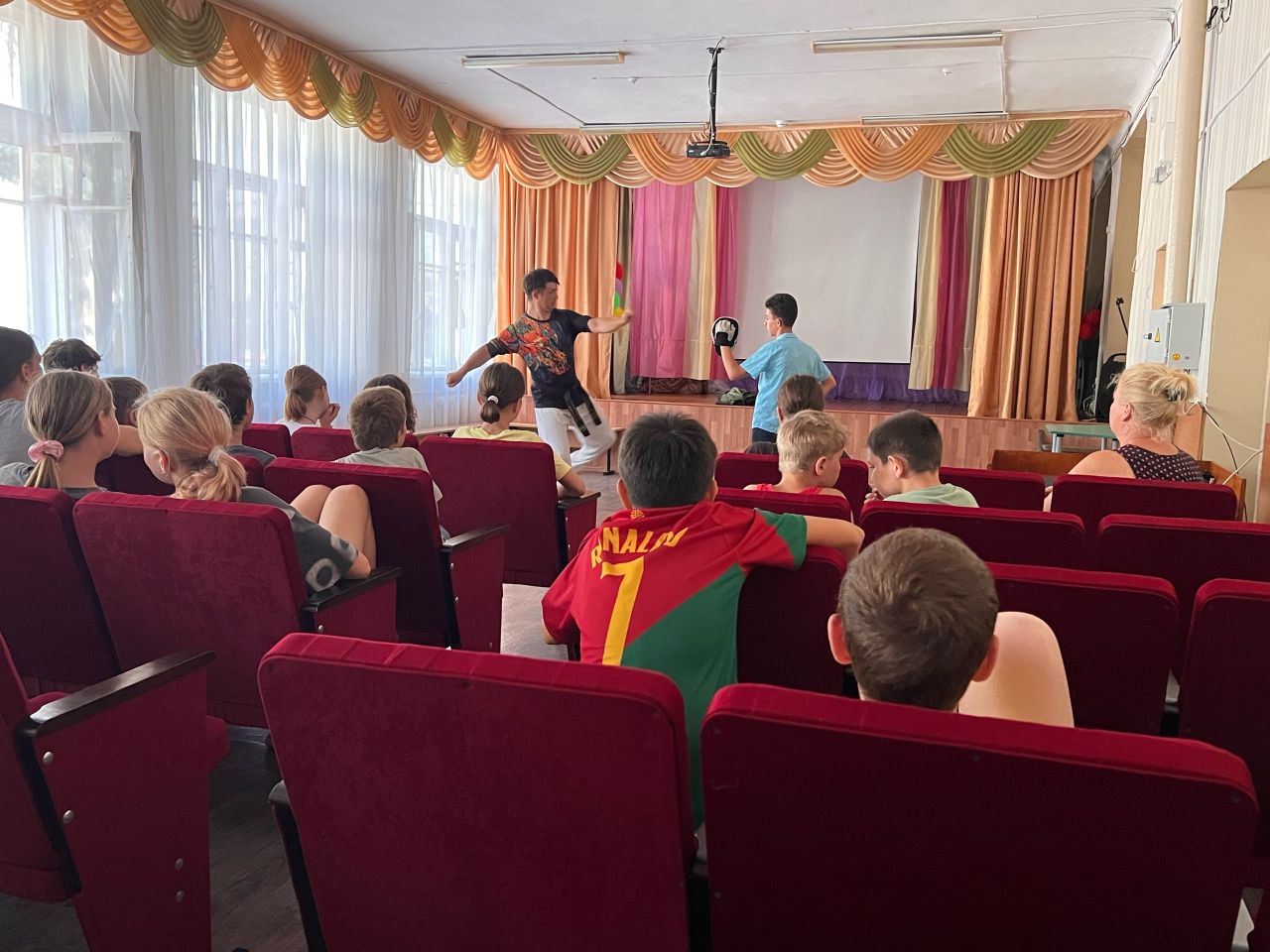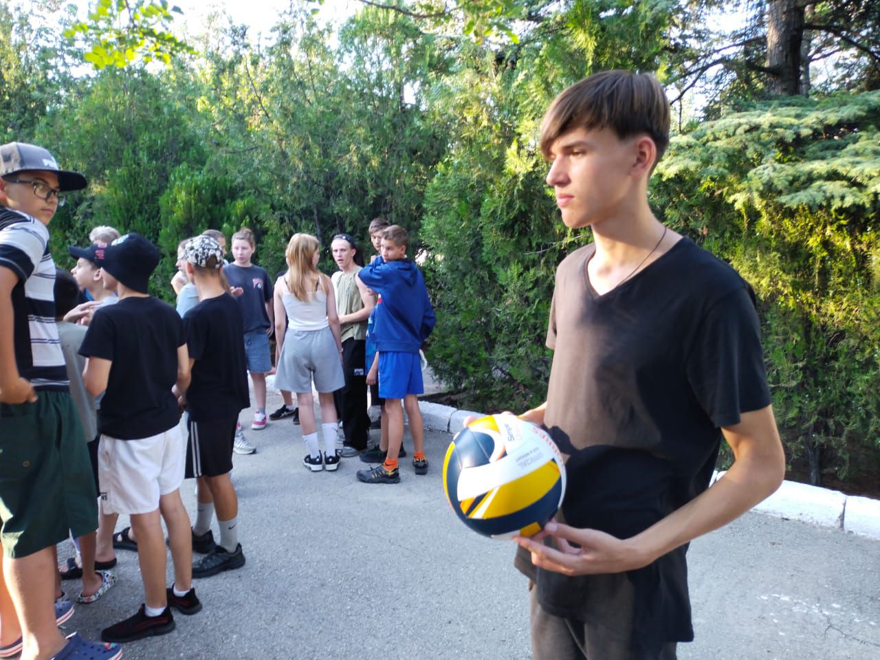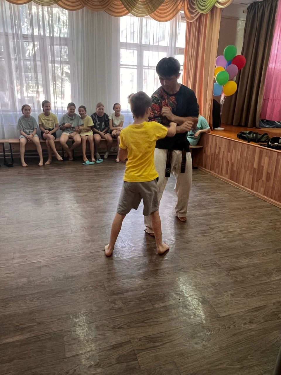 Ребята с большим интересом занимались на занятии по тхеквандо, приняли участие в разминке по самбо. В этот день прошли соревнования по футболу между 3 и 4 отрядами, а также ребята посоревновались в спортивной эстафете «Молодецкие забавы», которую провели волонтёры Молодежного совета г. Феодосии.